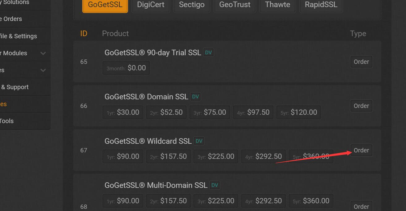 1:注册后进入个人中心首页点“New Order”开始选择证书购买,一般人就按照最便宜的买就行,另外他们也可以免费试用90天,到期后申请也是免费的,免费多久不清楚,我这里以购买收费版的通配符证书为例,如果你普通版选第二个就行了。30刀一年还是很便宜的。我买的是通配符90刀这个。